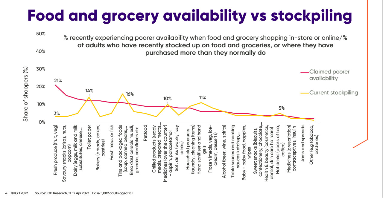 In the latest shopper research conducted for IGD (11-12 April 2022), more than half of adults (57%) interviewed experienced shortages of some food and groceries in-store or online recently. This is at a similar level to 56% in early March. This is still one of the lowest points since September’21.
