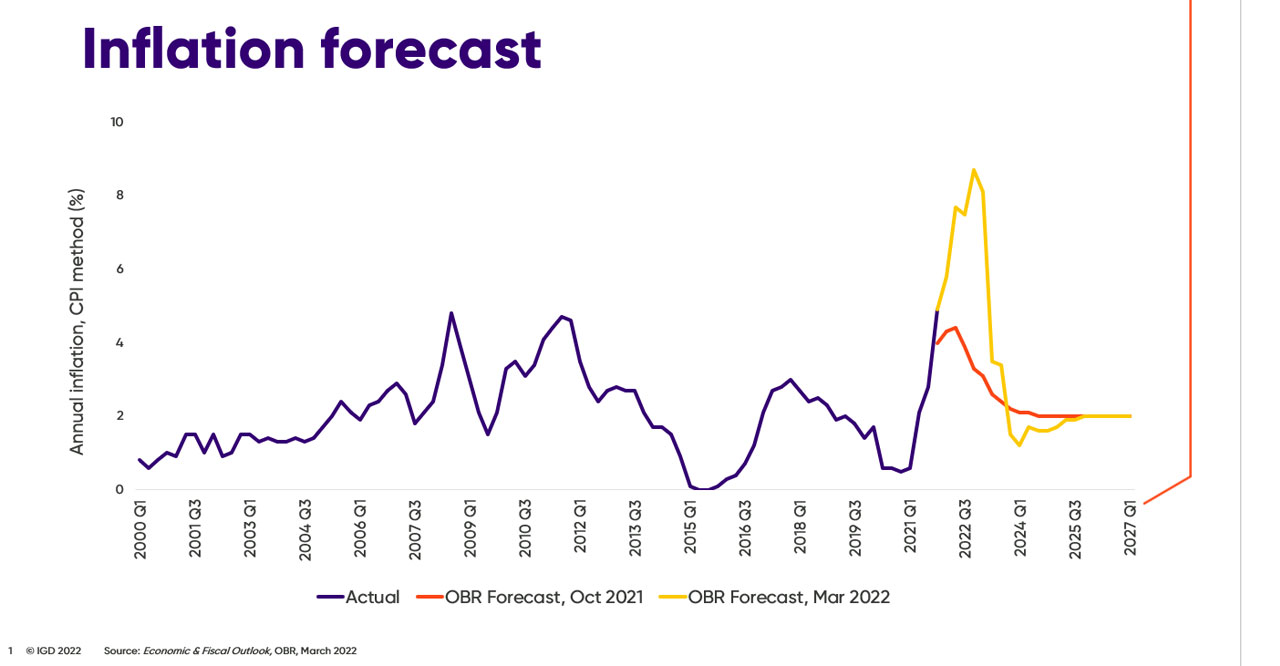 07 April 2022Inflation for shoppers in the UK continues to accelerate, with large contributions from food, motor fuel and household utilities.