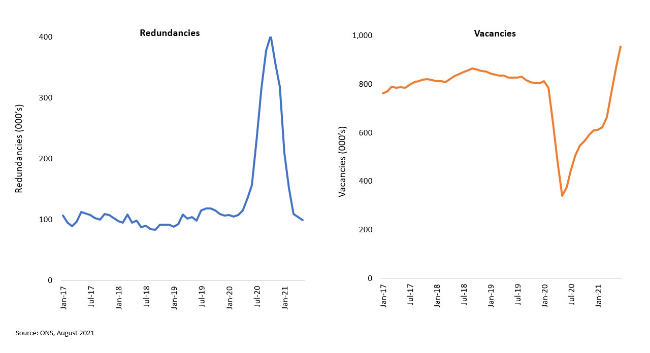 Demand for labour seems strong. The number of unfilled job vacancies stood at 953,000 in Jun 2021, which is a record for the UK.