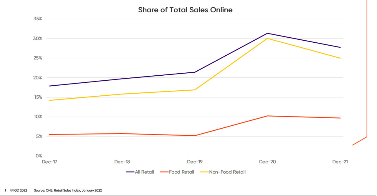 The pandemic has also driven growth in online retail channels for both food and non-food products, the chart below illustrates that this change looks to be permanent.