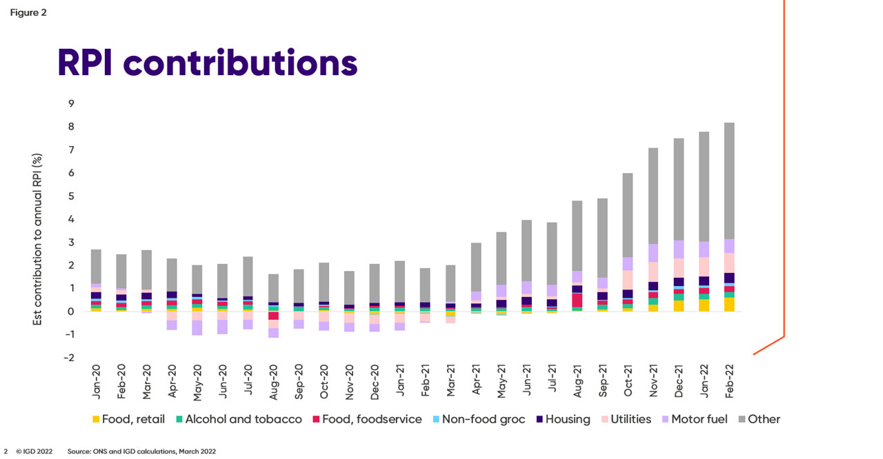 Note that ‘food and drink’, shown in the yellow bar now makes up a considerable contribution to inflation effects. Prices across food retail specifically are rising especially fast, up from 4.7% in January to 5.3% in February. This is having an impact on shoppers.