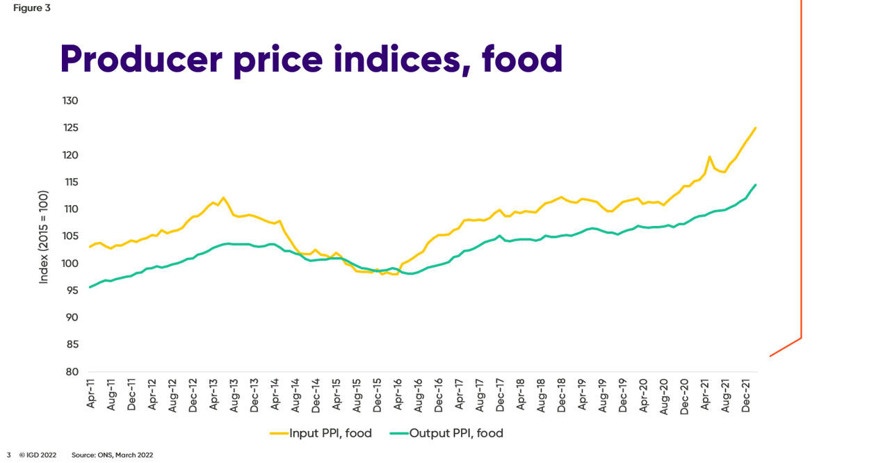 As shown in Figure 1, price rises in ‘food and drink’ have continued to accelerate dramatically, from -0.6% in August 2021 to 5.1% in February 2022. At the same time last year ‘food and drink’ inflation was -0.6%.