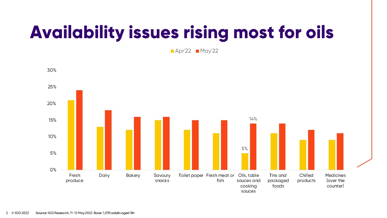 In the latest shopper research conducted for IGD (11-12 May 2022), the impact of the war in Ukraine is leading to increased availability concerns for UK shoppers.